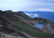 | 田ノ原からは正面に御岳を仰ぎながらの、登り一本調子の登山道を歩きます。 七合目で森林限界を抜け、九合目から一息で大滝山頂です。 最高峰の剣ヶ峰へはもうワンピッチ。登山道の左手の地獄谷からの噴煙が、ここが火山であることを実感させます。 剣ヶ峰を超えて、二ノ池付近の小屋で泊るツモリだったのですが、全部閉鎖されていて駄目。 避難小屋に泊ろうかと考えていたところ、「五ノ池小屋が営業している」との情報で、 急いで五ノ池まで歩き、泊めてもらいました。 これで一安心。夕方には外では小雪が舞っていました。今シーズンの初雪体験でした。 | |||
