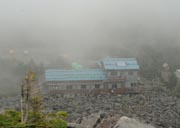 | 早朝タクシーで乗り付けた観音平はなんと薄曇り・・・。 展望もないのでそそくさと雲海、押手川を通り抜け、たどり着いた編笠山はまたもやガスの中でした。 せっかくの展望の山なのに残念ですね。 青年小屋で食事をしている間に、少し薄陽が射したので、権現岳へと向かいました。 | |||